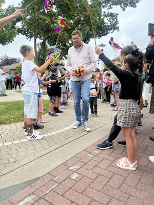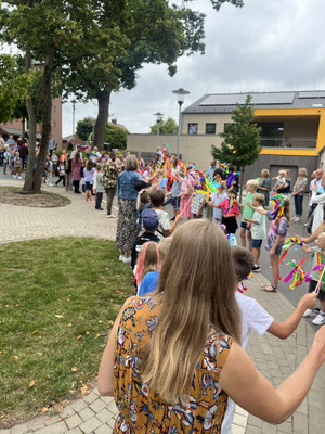 Anschließend fand die Verabschiedung auf dem Schulhof stat.t. Dort präsentierten die Kinder der vierten Klassen ein bewegendes Lied, das bei vielen für Gänsehaut sorgte. Danach wurden die Kinder unter dem Applaus der gesamten Schulgemeinschaft durch ein Spalier nach Hause entlassen.
